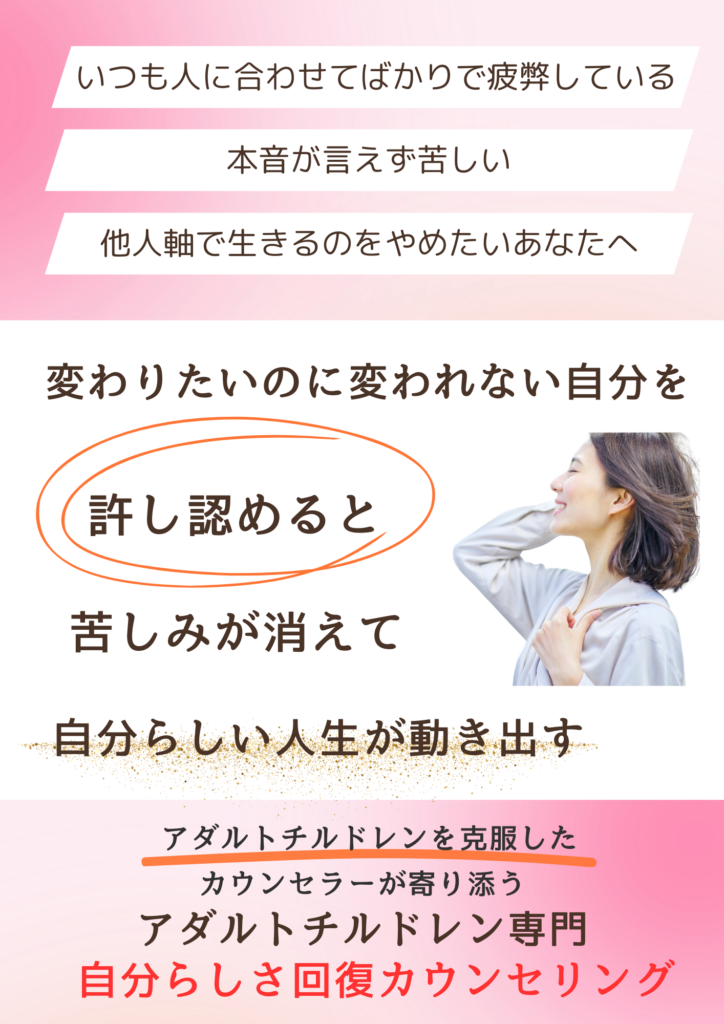 「いつも周りの顔色を伺って、自分の意見を言えずにいました。職場でも家庭でも『いい人』を演じ続けて、本当の自分がわからなくなっていました。頭では『このままではダメだ』と分かっているのに、変わることができずに、自分を責める毎日でした。