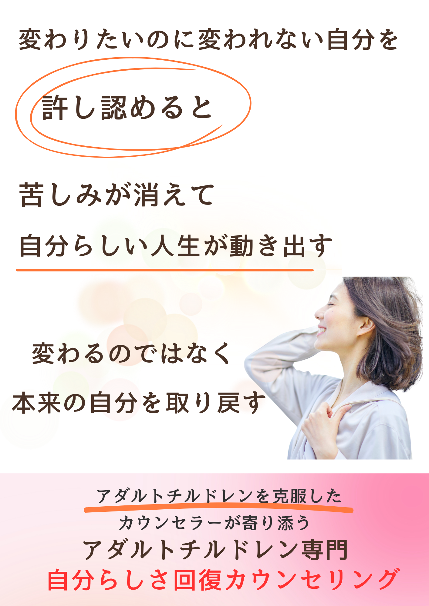 これまで抱えてきた苦しさや、生きづらさの意味を丁寧に紐解き、あなたのこれまでの頑張りを「正解」にしていきます。これからは、 本来のあなたを取り戻すための時間です。