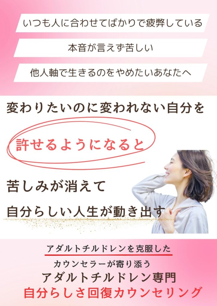 いつも周りの顔色を伺って、自分の意見を言えずにいました。職場でもプライベートでも『いい人』を演じ続けて、本当の自分がわからなくなっていました。頭では『このままではダメだ』と分かっているのに、変わることができずに、苦しかったです。